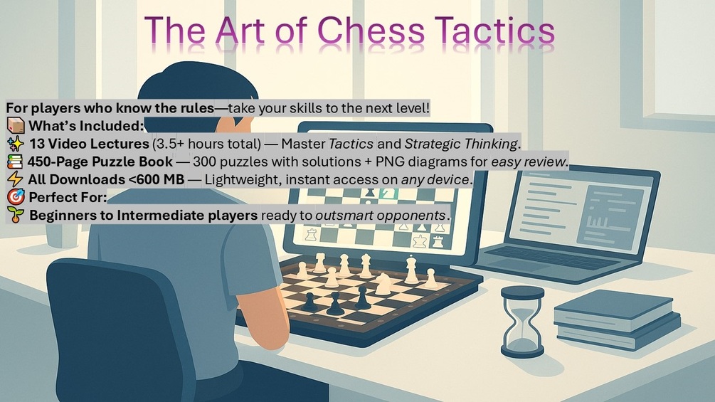 You'll get 13 step-by-step video lectures, a 450+ page chess book with 300 puzzles and solutions and PGN files of the puzzles. You may also recieve personal support if something is unclear